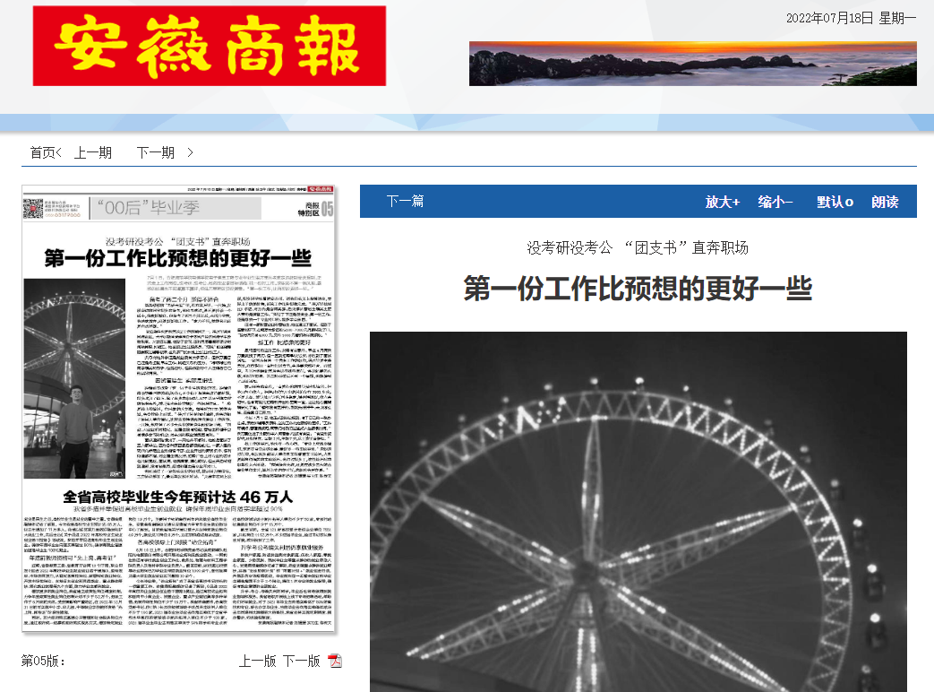 本网讯 近日,安徽商报以《没考研没考公 “团支书”直奔职场》为题,专题报道了beat365官网电子信息与电气工程学院电子信息工程专业毕业生洪万里同学的求职故事。