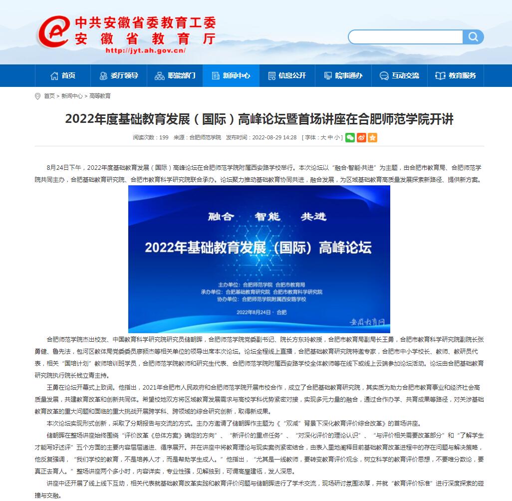 8月29日,安徽教育网以《2022年度基础教育发展(国际)高峰论坛暨首场讲座在beat365在线唯一官网开讲》为标题进行了报道。