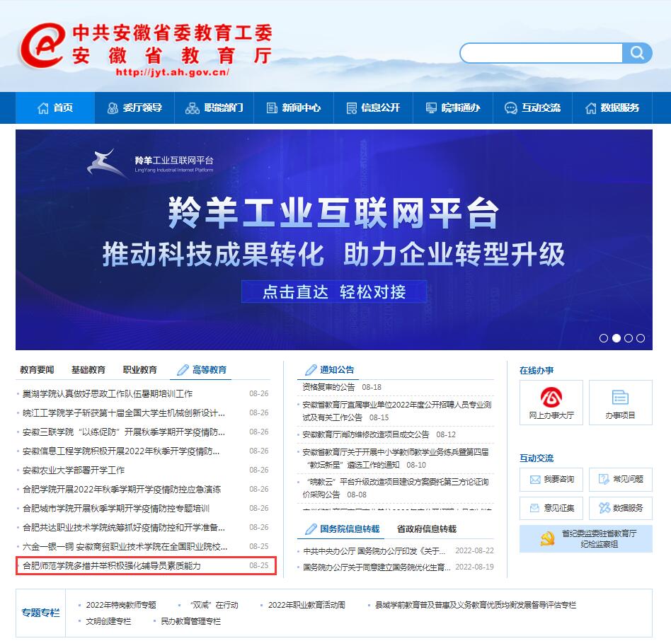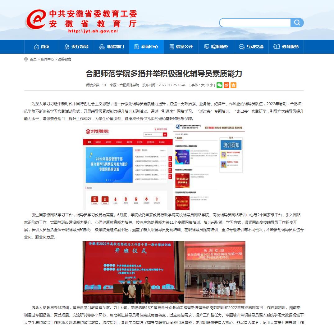 8月25日,安徽教育网首页以《beat365在线唯一官网多措并举积极强化辅导员素质能力》为标题进行了报道。