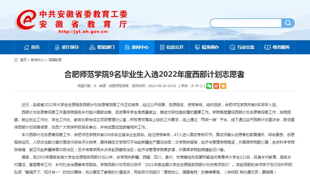 8月24日,安徽教育网首页以《beat365在线唯一官网9名毕业生入选2022年度西部计划志愿者》为标题进行了报道。