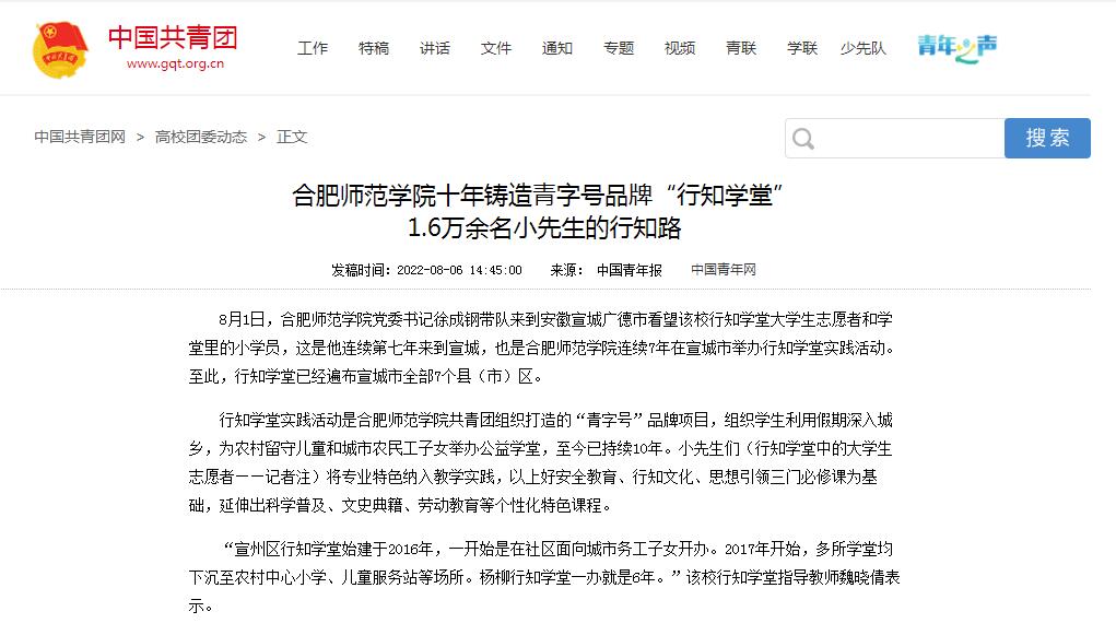 本网讯 8月6日,中国共青团网以《beat365在线唯一官网十年铸造青字号品牌“行知学堂”:1.6万余名小先生的行知路》为题,报道了我院“行知学堂”实践活动十周年历程。报道介绍了学院连续7年在宣城市举办行知学堂实践活动经历及十年来涌现出的基地学堂、特色课程、典型人物等事迹。(院团委)