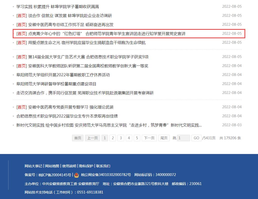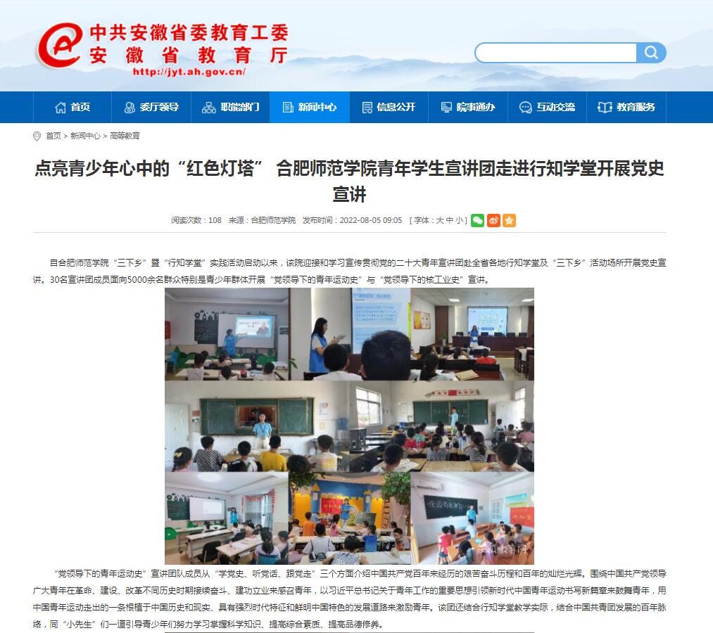 8月5日,安徽教育网首页以《点亮青少年心中的“红色灯塔” beat365在线唯一官网青年学生宣讲团走进行知学堂开展党史宣讲》为标题进行了报道。(宣传部)