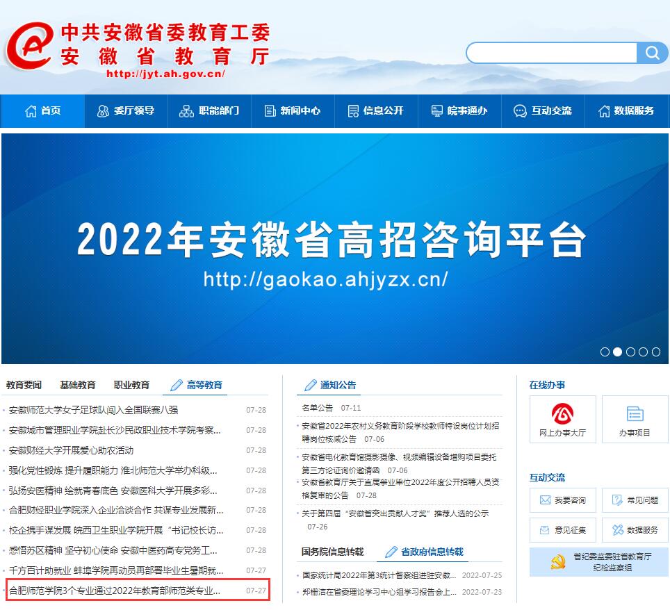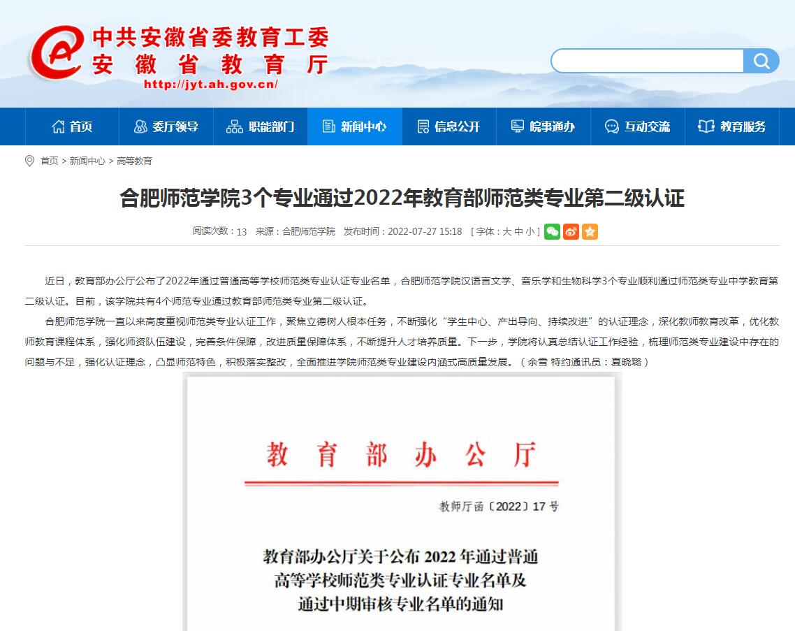 7月27日,安徽教育网首页以《beat365在线唯一官网3个专业通过2022年教育部师范类专业第二级认证》为标题进行了报道。