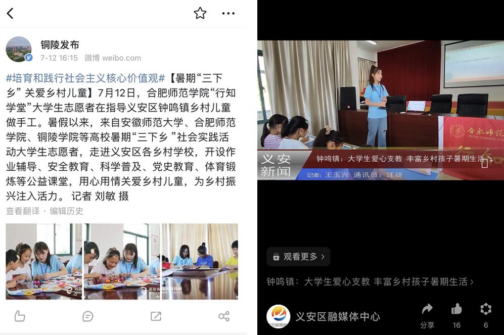 近日,院团委铜陵金榔行知学堂先后受到人民网、中青网、中安在线、安徽新闻网、铜陵市人民政府微博等多家媒体报道。(院团委)
