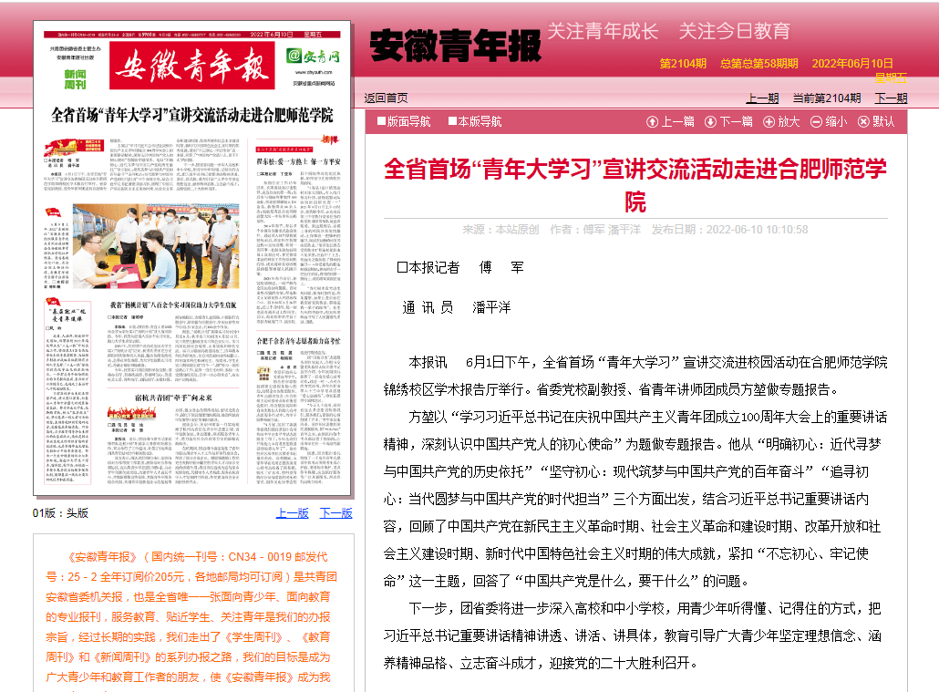 《安徽青年报》头版头条报道全省首场“青年大学习”宣讲交流进校园活动在我院举行