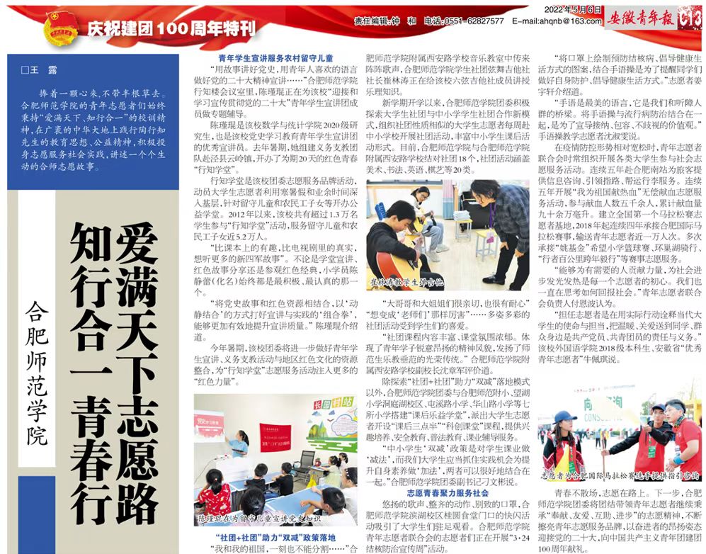 本网讯 5月6日,《安徽青年报》“庆祝建团100周年特刊”(第2093期C13版)以《beat365在线唯一官网:爱满天下志愿路 知行合一青春行》为题,从“青年学生宣讲服务农村留守儿童”“‘社团+社团’助力‘双减’政策落地”“志愿青春聚力服务社会”三个篇章,介绍学院党史青年学生宣讲、“行知学堂”社会实践活动、课后乐益学堂、“3·24结核防治宣传周”“爱在南站”等志愿服务品牌活动及青年志愿者服务合肥国际马拉松赛等赛事情况。(院团委)