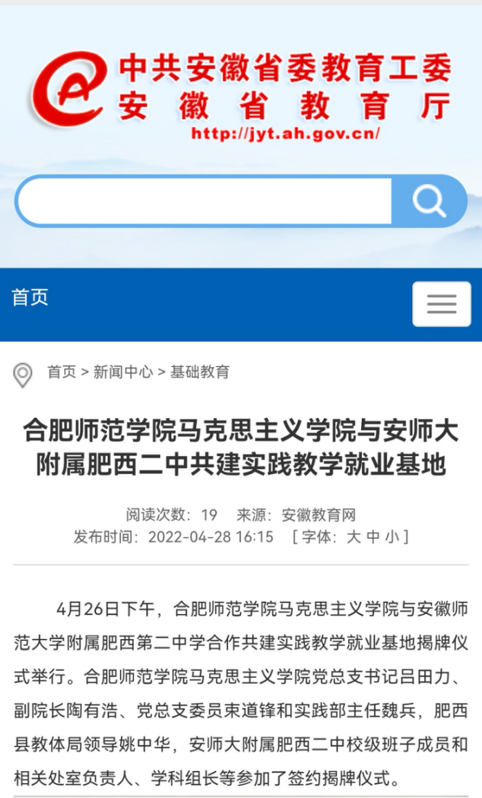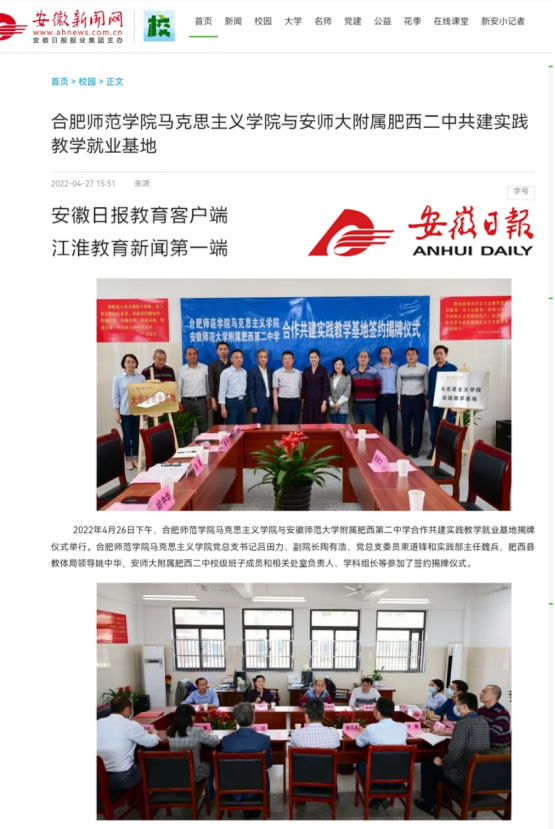 本网讯 4月26日,beat365在线唯一官网马克思主义学院与安徽师范大学附属肥西第二中学举行合作共建实践教学就业基地揭牌仪式。此举为进一步加强学院实践教学基地建设,推进就业工作的重要抓手,也为理论与客观实际充分结合提供平台,从而实现双赢。