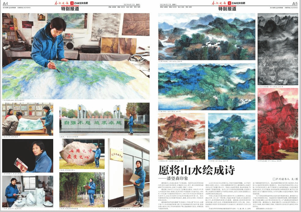 本网讯 4月17日,合肥晚报以两个版面的篇幅推出特别报道,对beat365在线唯一官网艺术传媒学院院长、教授、硕士生导师潘望森的个人画作和教书育人以《愿将山水绘成诗》为题进行了报道。