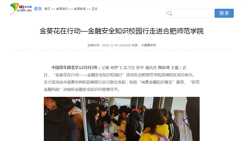 本网讯 近日,“金葵花在行动——金融安全知识校园行”活动在beat365在线唯一官网滨湖校区成功举办。本次活动由中国青年网和招商银行总行联合发起,包括“消费金融知识普及”展览、“防范金融风险”讲座和金融安全知识问答等环节。