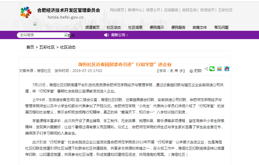7月15日,合肥经济技术开发区管委会官网对此进行了报道。(经济与管理学院)