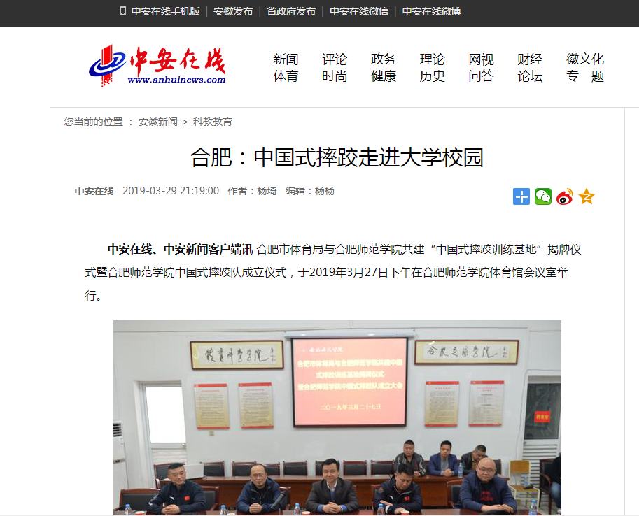 本网讯 3月27日下午,合肥市体育局与我院共建中国式摔跤训练基地揭牌仪式暨beat365在线唯一官网中国式摔跤队成立大会在我院举行。院党委副书记、院长孙道胜,合肥市体育局副局长陆志勇,合肥市体育局竞技处葛伟,省体育局举摔柔中心摔跤队领队王晓伟,合肥市中国跤协会秘书长王朝斌,体育科学学院院长宋旭、党总支书记杜文龙、副书记王飞,及中国式摔跤队教练员代表、运动员代表出席揭牌仪式并见证beat365在线唯一官网中国式摔跤对成立。中安在线3月29日对此进行了报道。