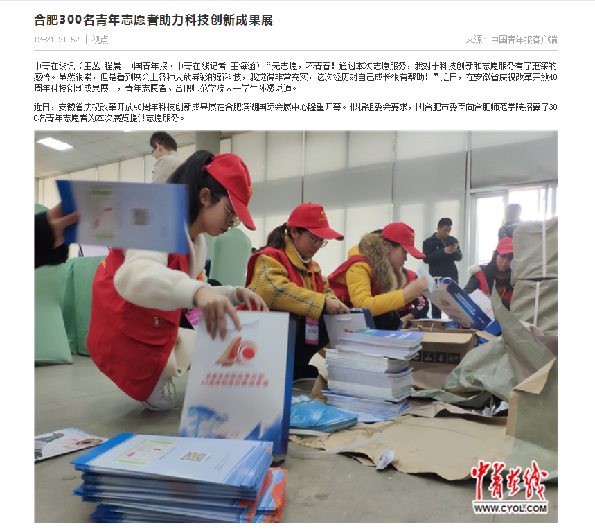 本网讯 2018年12月18日上午,安徽省庆祝改革开放40周年科技创新成果展在合肥滨湖国际会展中心隆重开幕,我院共招募300名青年志愿者为本次展览提供为期2周的志愿服务。中青在线于12月21日对此进行了报道。(院团委)