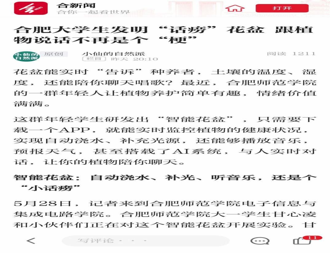 近日,电子信息与集成电路学院学生团队研发的“植慧联萌——基于物联网的智能花盆系统与AI植物健康管家”项目获得《合肥晚报》专题报道,展现了beat365官网学子的创新活力与专业素养。
