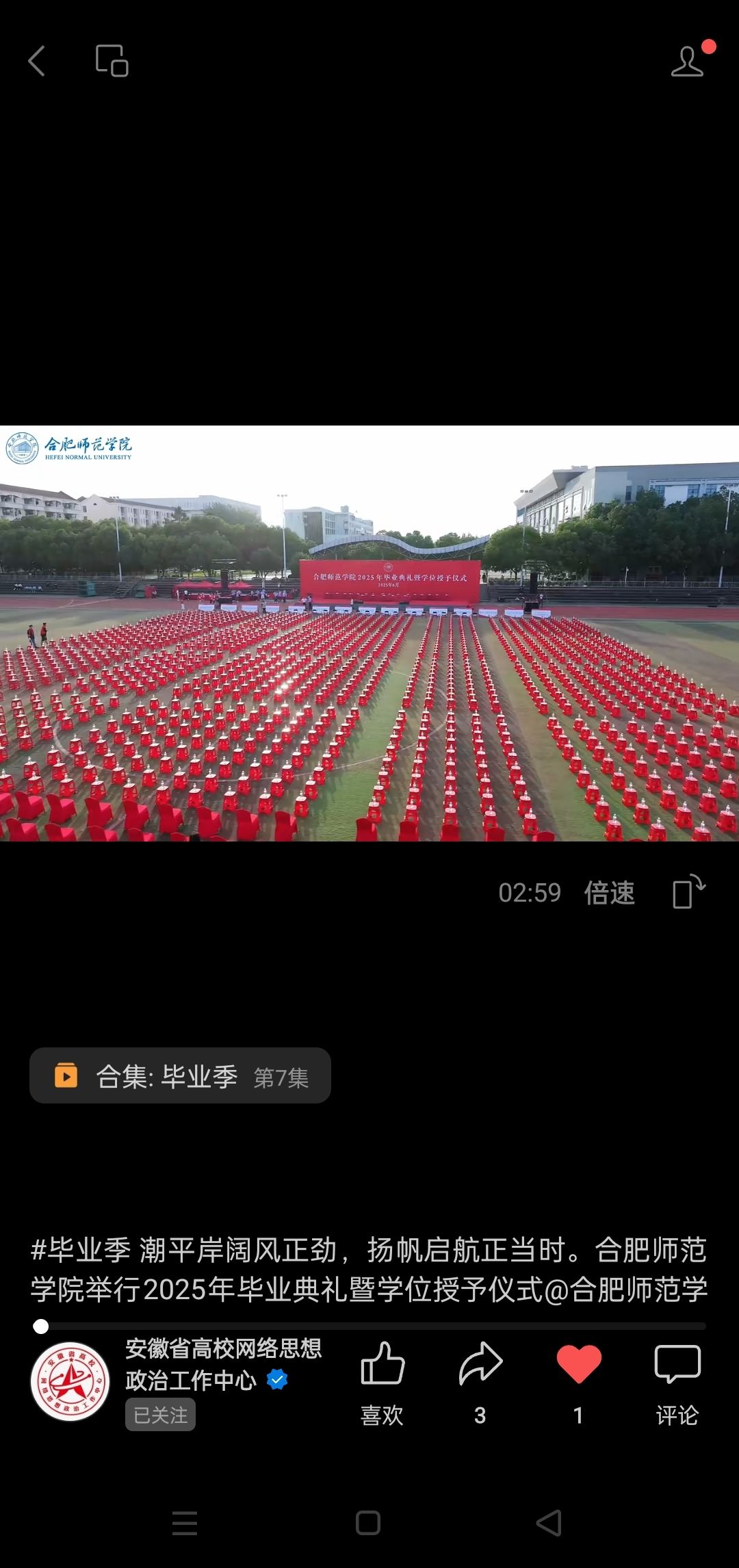 6月23日,安徽省高校网络思想政治工作中心视频号发布我院2025年毕业典礼暨学位授予仪式视频。(宣传部)