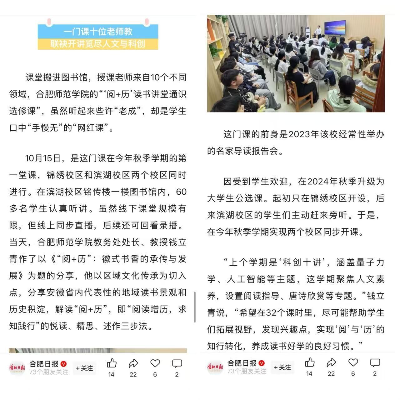 本学期“阅+历”读书讲堂在锦绣校区和滨湖校区同时举行,作为一门线下精品通识选修课程,旨在利用32个课时,尽可能帮助学生们扩大见识,拓展视野,发现兴趣点,实现“阅”(认知)与“历”(实践)的知行转化,培养读书好学的良好习惯。这种其创新模式与显著成效获不仅获得广大师生的认同与好评,也得到了社会媒体的高度关注。近日,合肥日报记者主动前来进行专题采访,并先后在《合肥日报》、《合肥晚报》上以《一门课十位老师教——联袂开讲览尽人文与科创》《高校课堂“变形记”,解锁知识新方式》为题进行了报道。