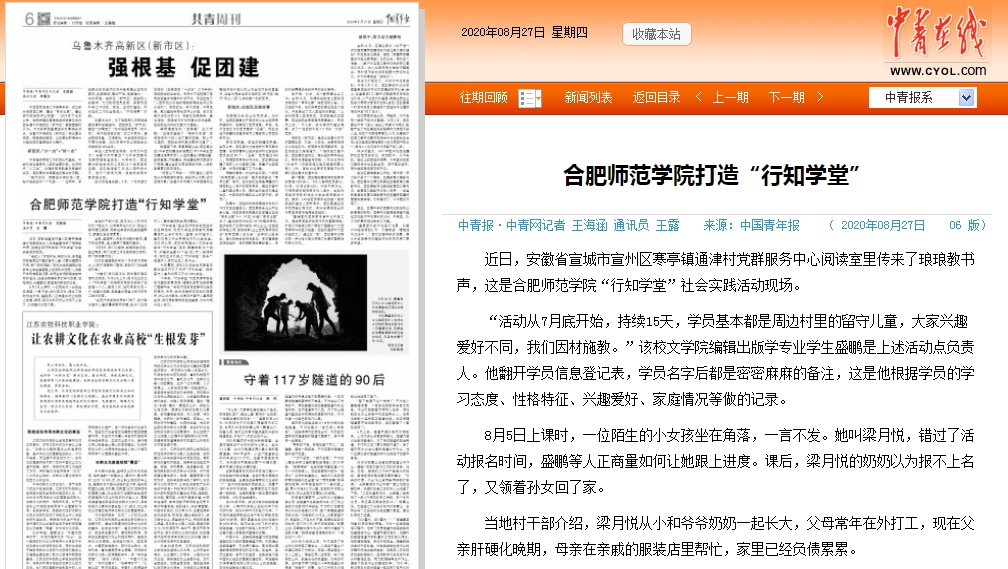 今年暑期“三下乡”暨“行知学堂”实践活动成果丰硕,社会影响进一步扩大,中国青年报、中国青年网、安徽日报、中青校园、安徽教育网、安徽学联微信号、合肥市庐阳区政府、宿州共青团等多家主流媒体累计报道336次。“听军爷爷讲故事”社会实践团队荣获第六届中国“互联网+”大学生创新创业大赛选拔赛暨安徽省“互联网+”大学生创新创业大赛红色之旅赛道金奖、冠军,第九届“挑战杯”安徽省大学生创业计划竞赛金奖。