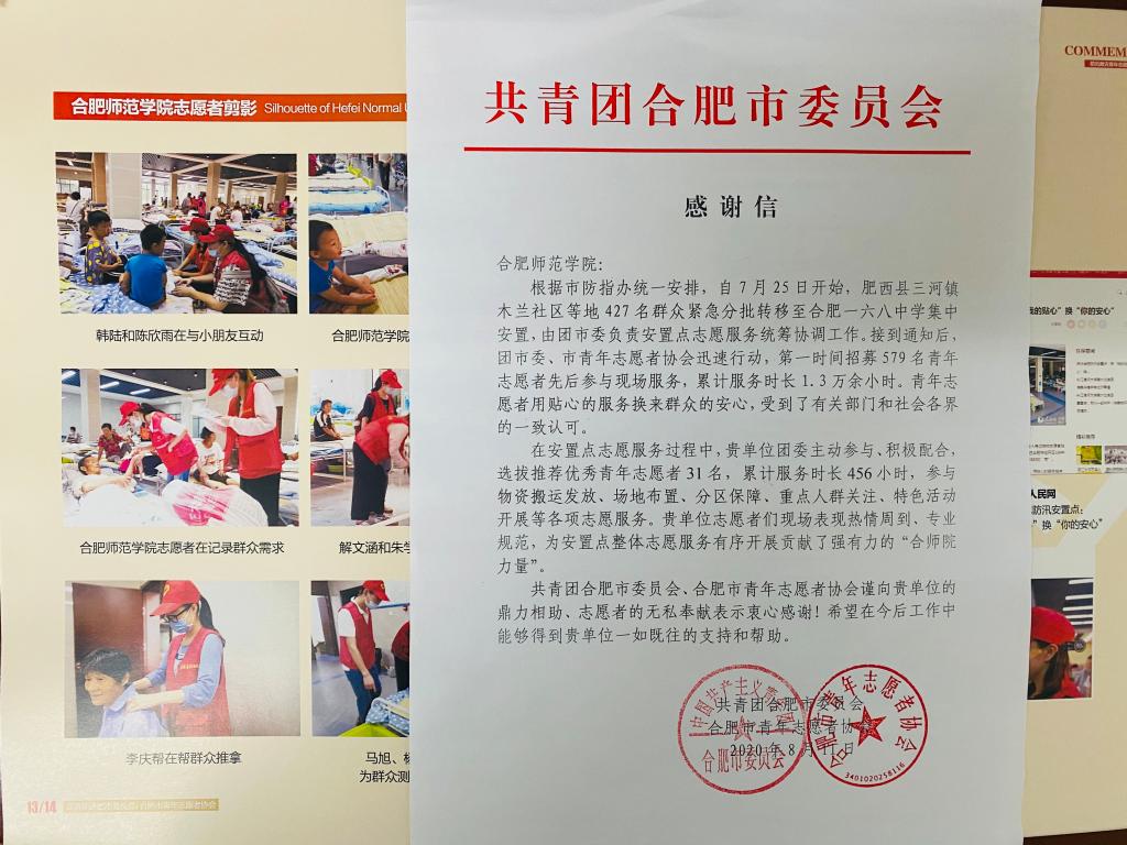 根据市防汛指办统一安排,自7月25日开始,肥西县三河镇木兰社区等地427名群众紧急分批转移至合肥一六八中学集中安置,由团市委负责安置点志愿服务协调统筹工作。学校主动参与、积极配合,第一时间选拔招募优秀青年志愿者36名,累计服务时长456小时,参与物资搬运发放、场地布置、分区保障、重点人群关注、特色活动开展等各项志愿服务。音乐学院2018级音乐表演专业的杨柳同学在安庆市怀宁县洪镇扛起沙袋,在暴雨里穿梭,在泥泞里战斗,彰显守土保家的责任之心。位处家乡安徽省芜湖市的体育科学学院2017级运动训练专业杨成龙同学面对距离历史极值仅有0.19米、还在不断上涨的长江水位的危机局面,毅然“出战”,光荣地成为了芜湖市镜湖区天门山街道(长江天门山段)防汛抢险工作中的一名志愿者。生命科学学院2017级食品专业尹新雅同学赴含山县环峰镇民政局防汛安置点参加防汛志愿服务,为安置点的老人分发生活日用品,为他们送饭,搬运爱心人士捐献的物资。