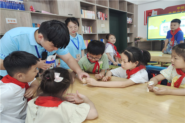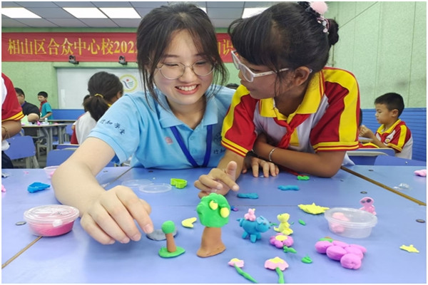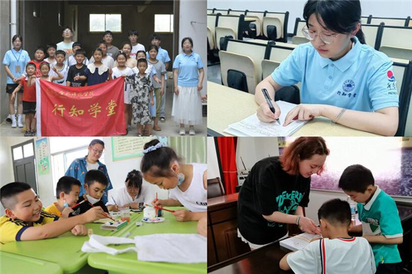 武汉大学工商管理专业学生刘欣同学参加了在阜阳市太和县城关镇复兴路社区开办的丹心向党行知学堂,参与学堂课程编排、联系课外教师等工作,邀请中国编制协会会员姚芳应邀来到学堂讲授《传统手工艺编织艺术》课程,同小学员们一同编制手工同心结、中国结等传统手工艺品。哈尔滨工业大学材料化学专业学生袁理同学、华南理工大学经济学专业赵梦琴同学参加安庆市潜山市源潭镇文化广播站开办的源潭行知学堂,分别教授《物理实验课》《化学实验课》和《党史宣讲》《课业辅导》等课程。内蒙古大学计算机科学与技术专业石晨旭同学在在亳州市谯城区五马镇芍花村的老大队部开办的行知成长行知学堂,承担《课外知识》《红色文化》《课业辅导》等课程教学。安徽大学历史学专业王雨欣、潘琪、陆明扬、王芷萱等同学参加了在宣城市绩溪县瀛洲龙川小学举办的绩溪瀛洲行知学堂,同我院“小先生”们一同策划了“印象绩溪”传承地域特色文化主题实践活动。鲁迅美术学院艺术设计学专业周昕怡同学参加了在阜阳市颍州区三塔镇三塔集兴轩托管中心开办的萤火虫行知学堂,教授或开展科普生活小常识、智力游戏、课外活动、一起包饺子等课程和活动。