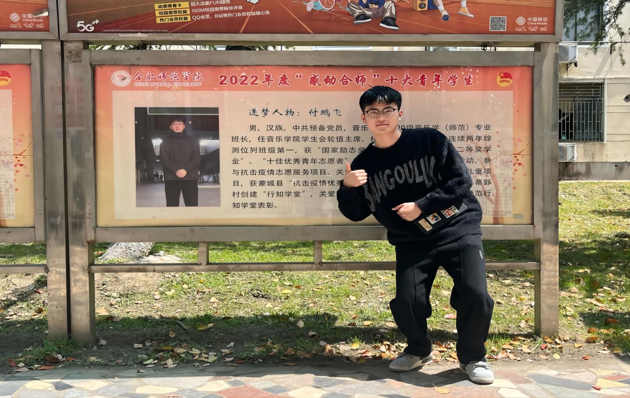付鹏飞,男,中共党员,beat365在线唯一官网音乐学院2020级音乐学(师范)专业。曾任音乐学院学生会轮值主席、现任20级音乐学3班班长。连续四年综测位列班级第一。曾获“国家奖学金”“国家励志奖学金”“优秀学生一等奖学金”“2023年安徽省高等学校师范生技能竞赛二等奖”“第十四届安徽青年志愿者优秀个人”“2022年感动合师十大青年”“十佳优秀青年志愿者”“十佳优良学风个人”“优秀志愿者”“优秀学生干部”“优秀共青团员”“优秀小先生”“优秀军训学员”等称号。身为班长带领班级荣获“2021年优良学风班级”“2022年十佳优良学风班级”。积极参与并主持省级大学生创新创业项目4项。他热心公益事业,积极主动投身志愿服务活动,在抗击疫情志愿服务项目、关爱抗战老兵服务项目、助力乡村振兴项目中积极参与、尽己所能贡献力量,荣获蒙城县“抗击疫情优秀志愿者”称号。暑假期间连续三年参与乡村支教活动共带领70名同学先后服务800余名乡村留守儿童。在校内评选中荣获2021年院级优秀行知学堂、2022年校级示范行知学堂、2023十佳基地学堂。